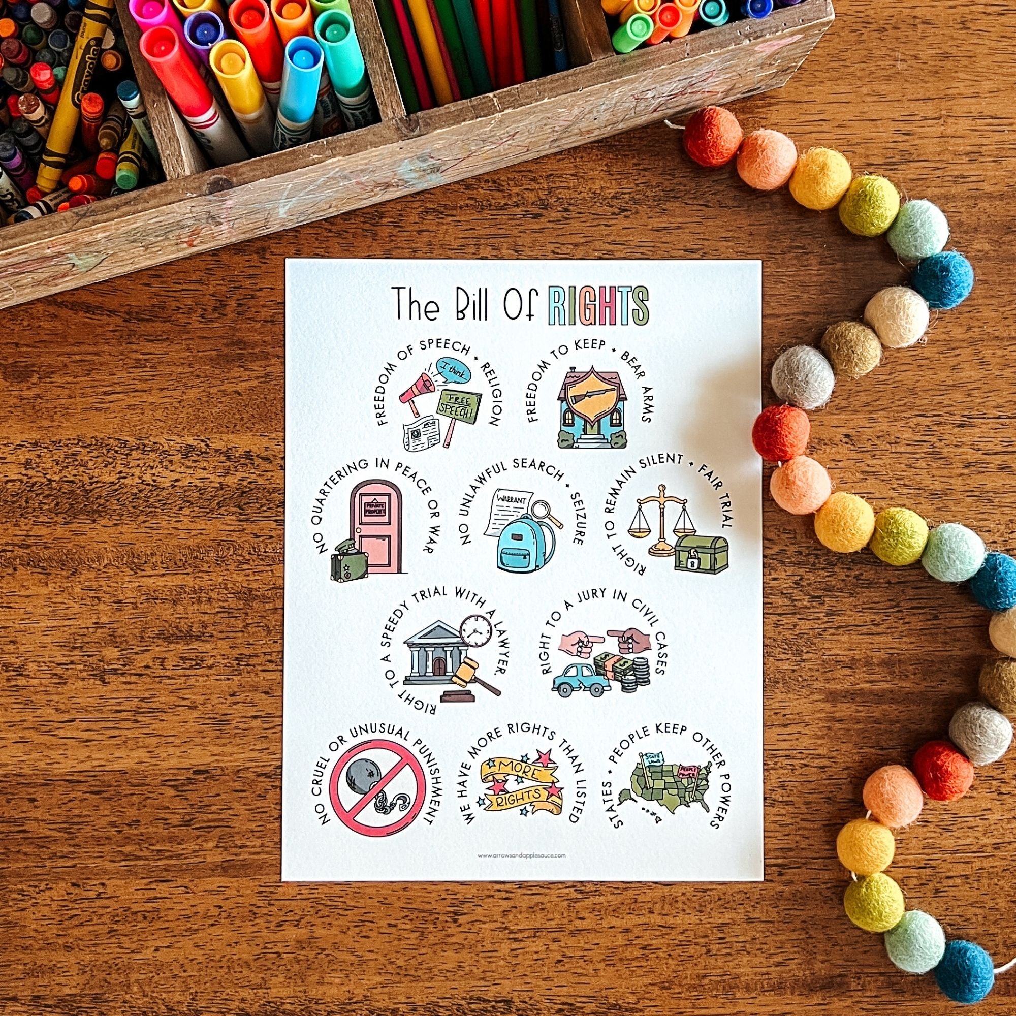 - Simplified explanations of each amendment (kid-friendly wording)
